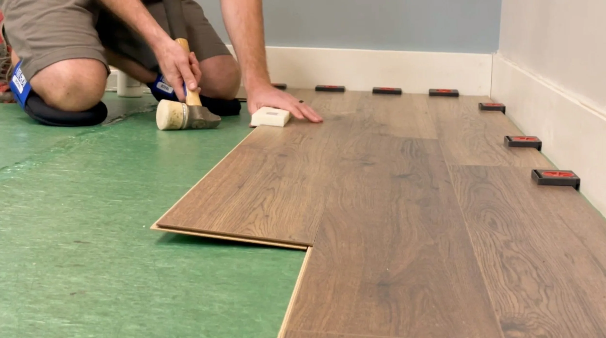 Laminate flooring is made for a “floating floor” installation, which means it doesn’t need glue, nails, or staples. Instead, the boards feature a special tongue-and-groove design that allows them to lock together securely by snapping the edges into place.